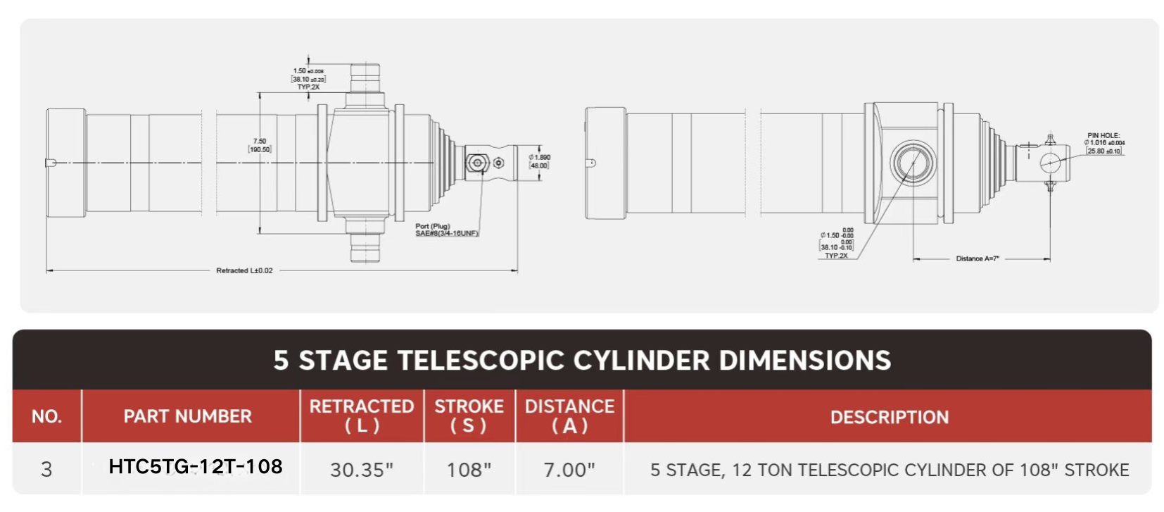 سیلندر تلسکوپی سکته مغزی "HTC5TG-12T-108"، 5 مرحله ای، 12 تن از 108"