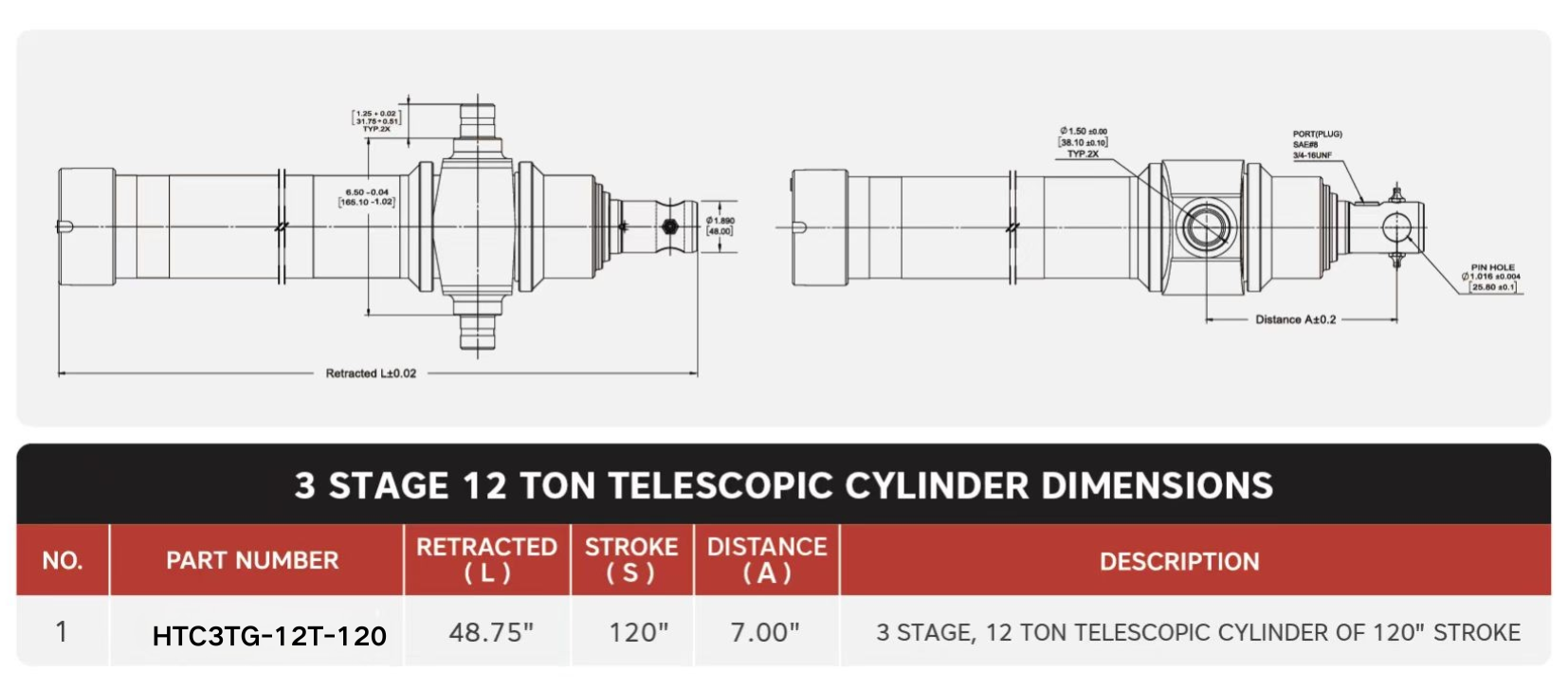 سیلندرهای تلسکوپی سکته مغزی "HTC3TG-12T-120"، 3 مرحله، 12 تن از 120"