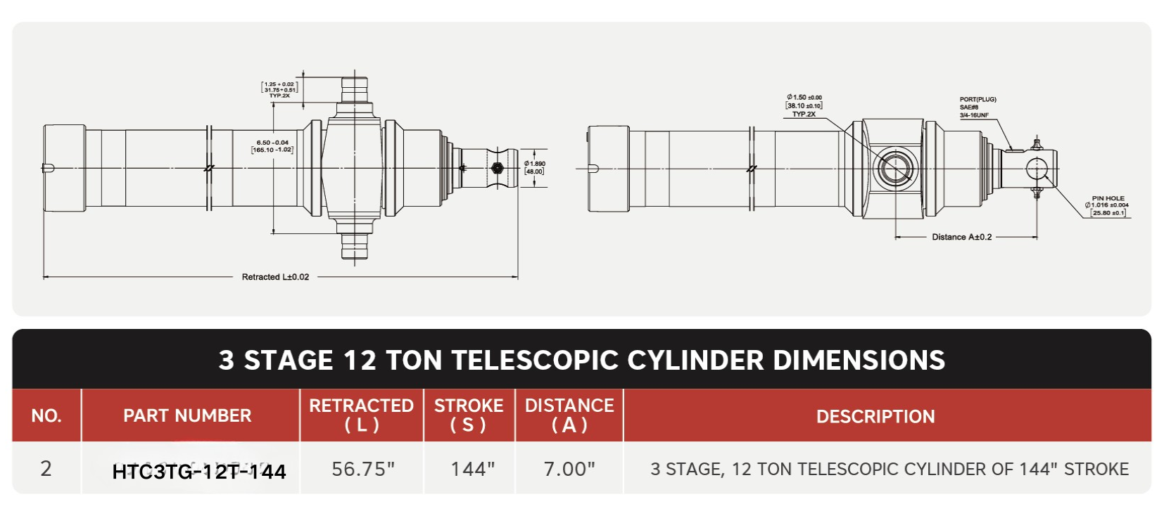 سیلندرهای تلسکوپی سکته مغزی "HTC3TG-12T-144"، 3 مرحله، 12 تن از 144"